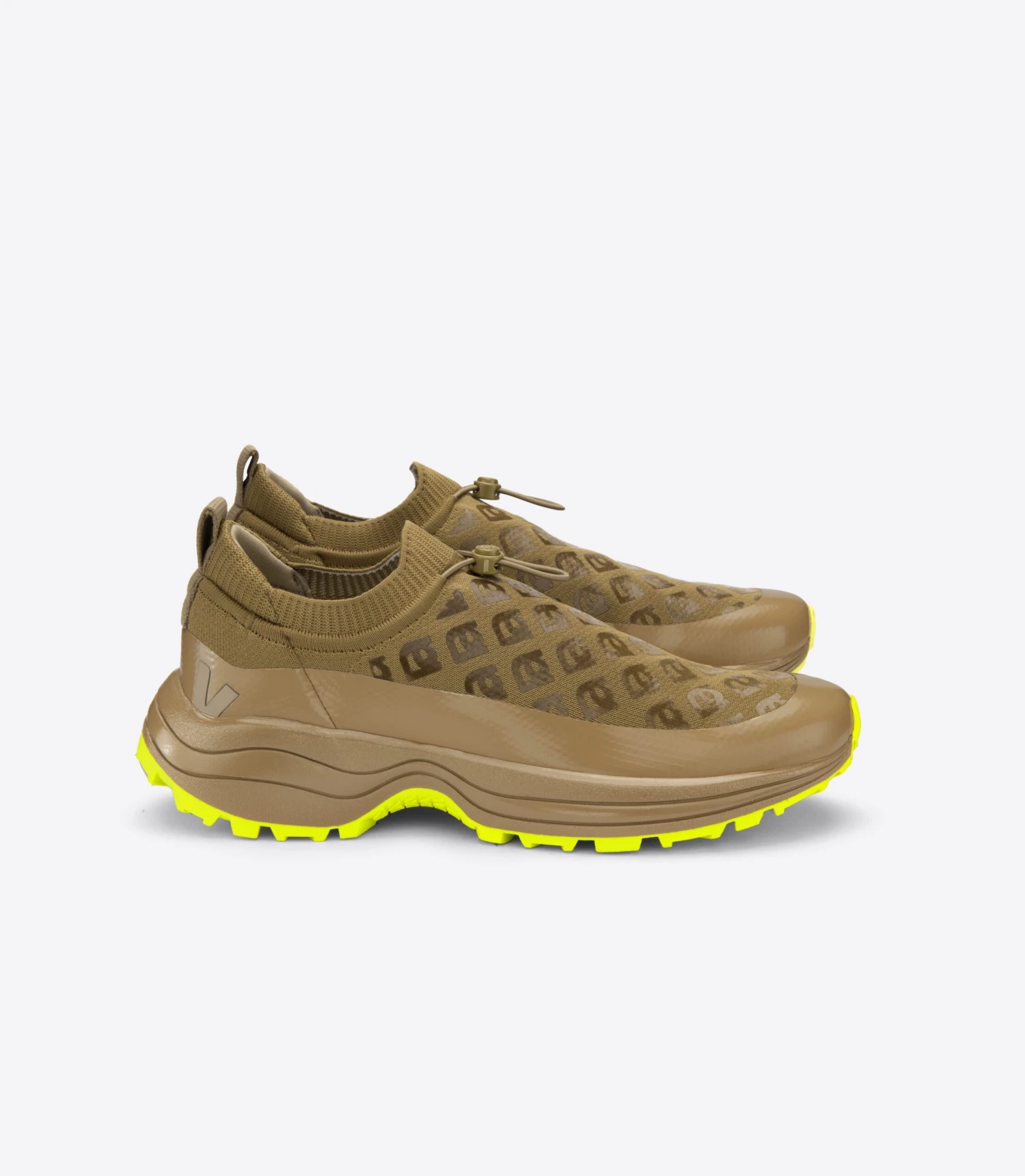 Inspired by the outdoors with a thick all-terrain sole, its design is akin to a comfortable clog. With a tongue-in-cheek nod to luxury brands and knock-offs, Amélie Pichard and VEJA added a monogrammed pattern to its stretchy upper.